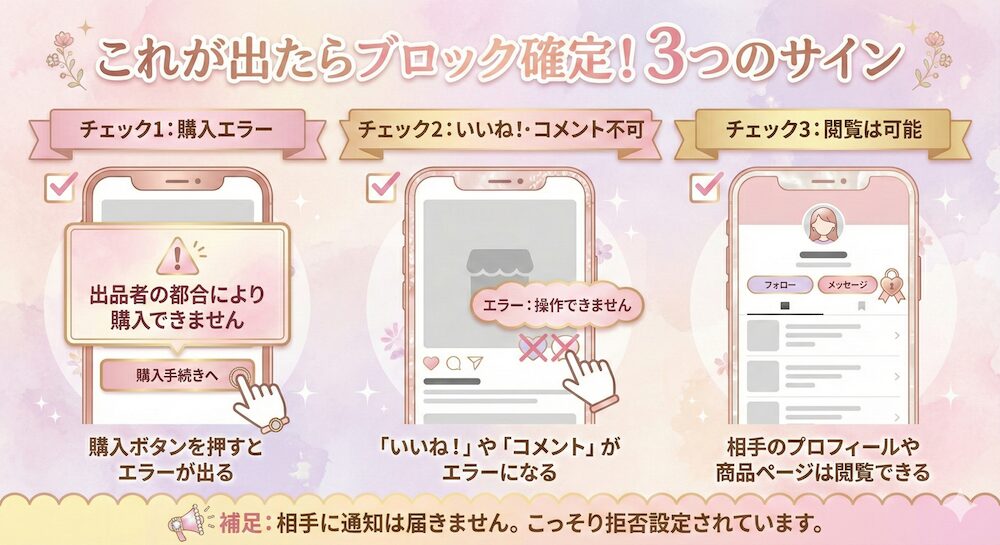 | ページは見られる | 商品ページ・プロフィールは 普通に閲覧できる | 「見える=ブロックされていない」 は誤解 |