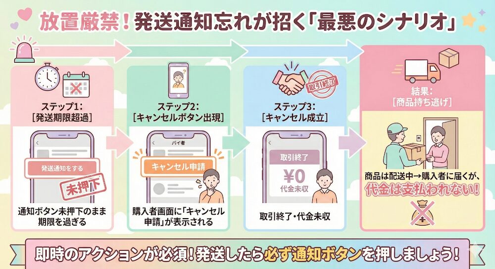 結論から言えば、発送通知を押さずに放置すると 取引そのものが強制終了し、商品だけ相手に届いてしまう(=商品持ち逃げ状態)という、出品者にとって最悪の事態になりかねません。