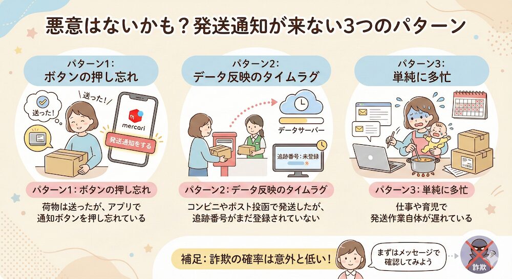 ここでは、出品者が発送通知を送らない代表的な3つのパターンを解説します。