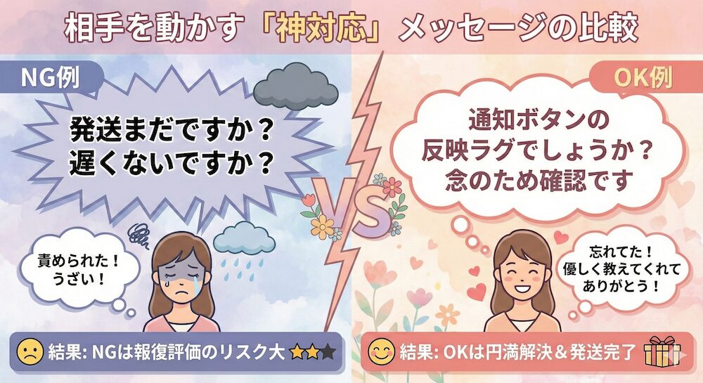 このメッセージのポイントは、「あなたは発送してくれていると信じていますが、システムのせいで通知が来ていないだけですよね?」という性善説の前提に立っていることです。